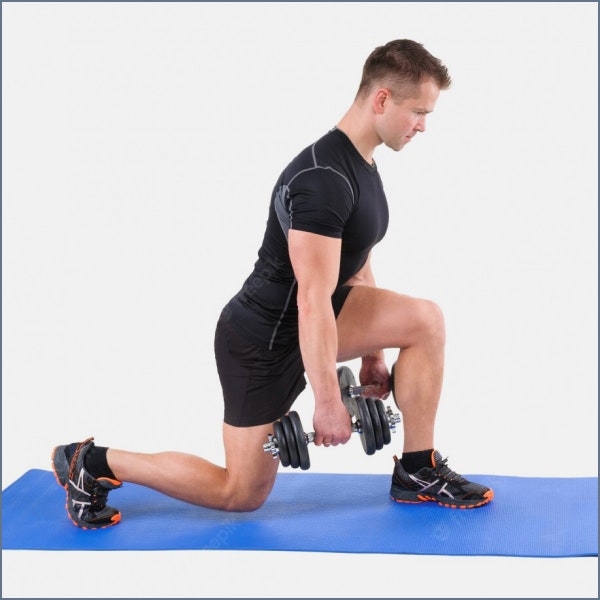 - Bend both knees to slowly lower your hips to the ground until your back knee almost touches the floor.